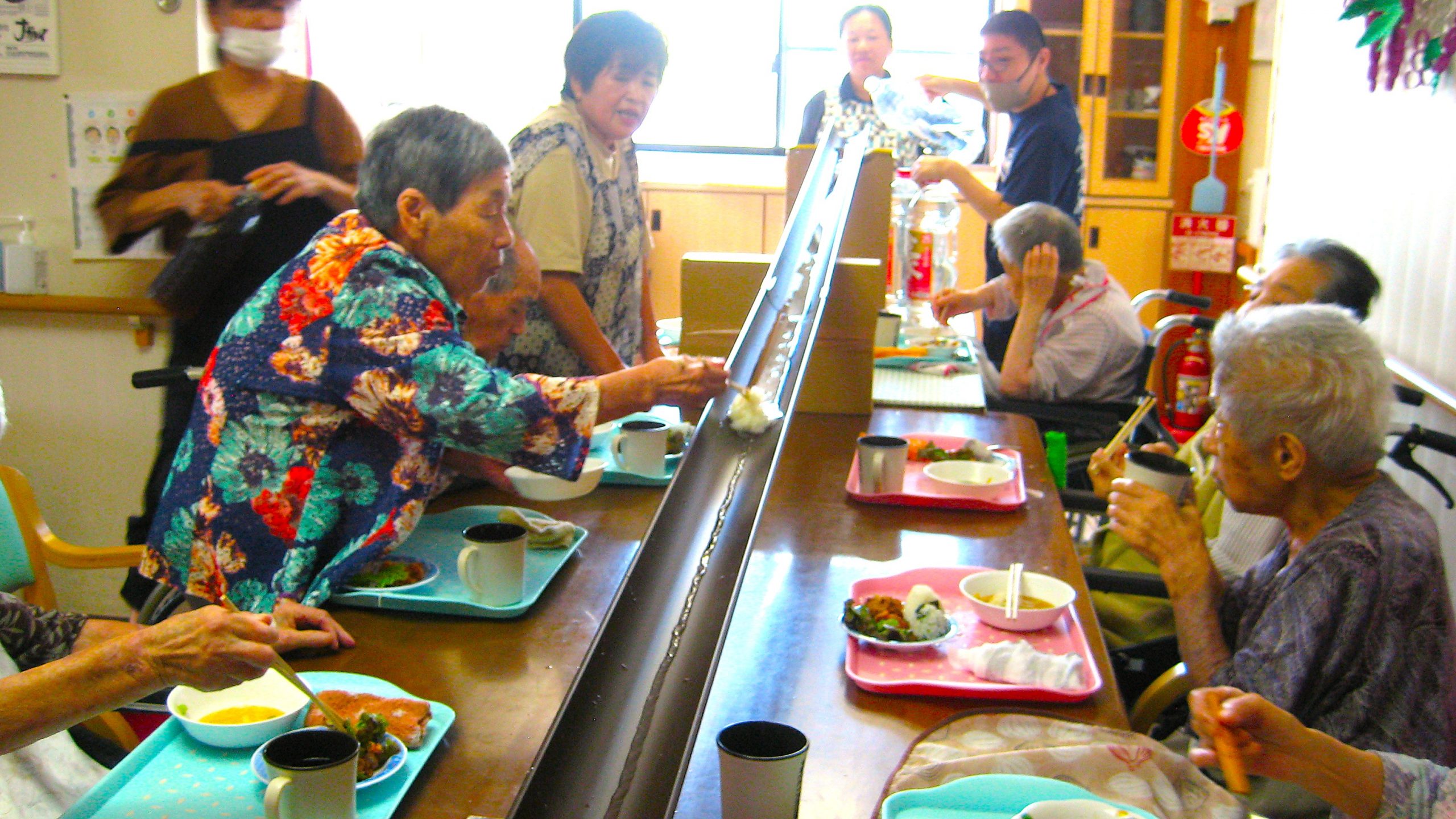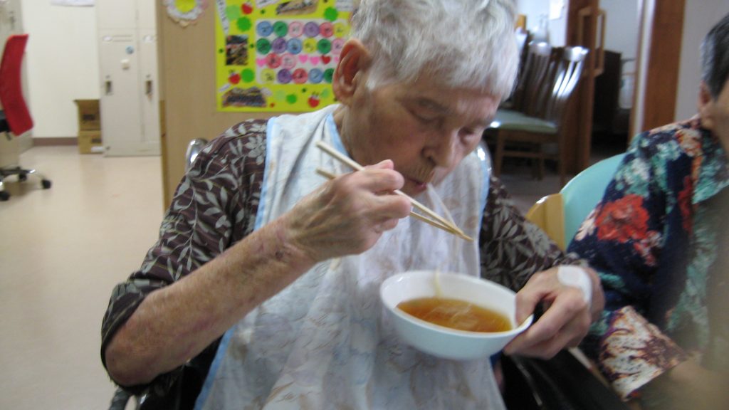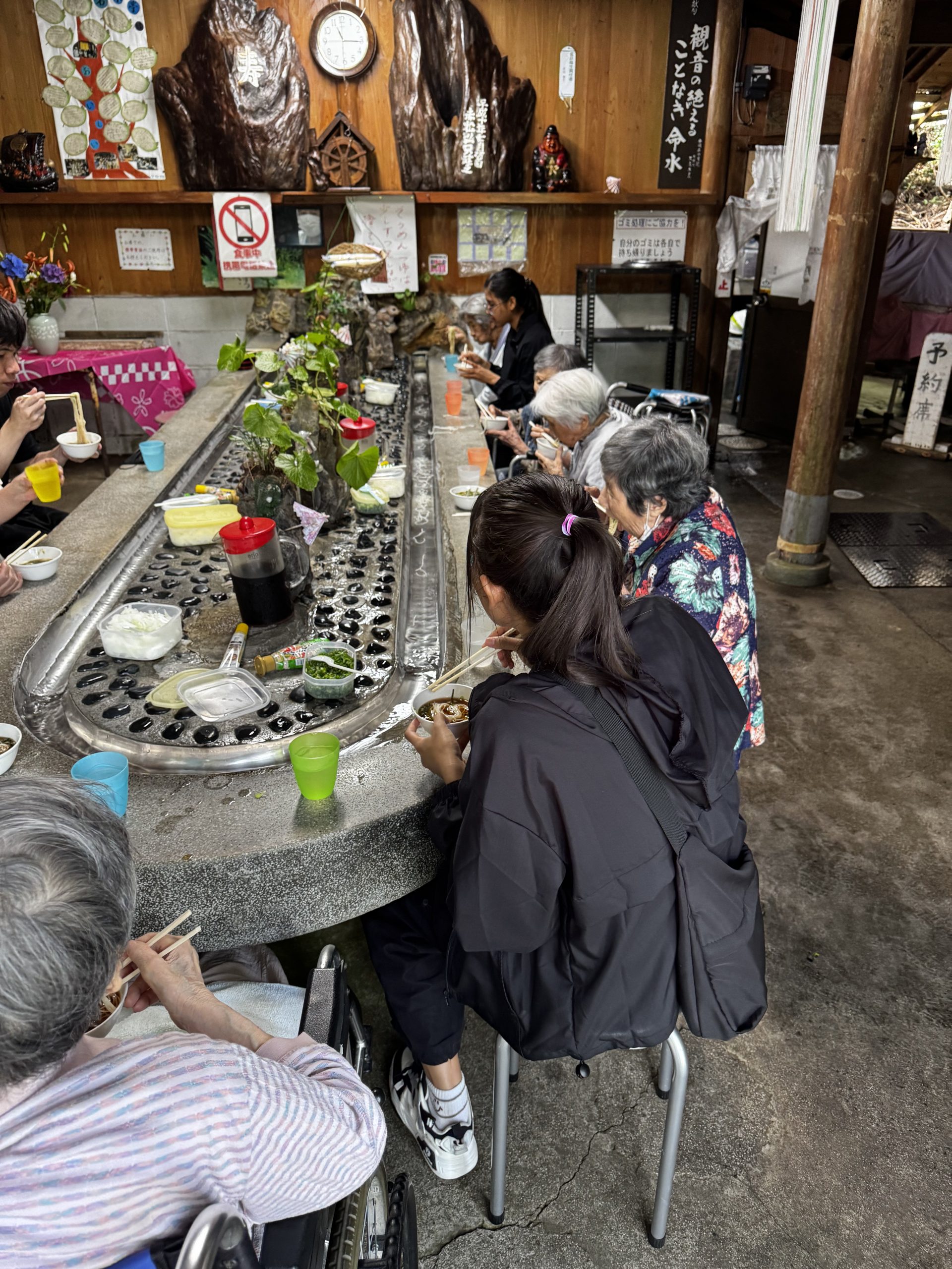 グループホーム銀河5階は、西予市宇和町にある観音水そうめん流しに行きました。ここは涼しくておいしいそうめんに舌鼓。3階では夏まつりの行事で、そうめんやプチトマトなども流し、みんな真剣な表情ですくっていましたが、食べるときは笑顔で楽しくいただきました。