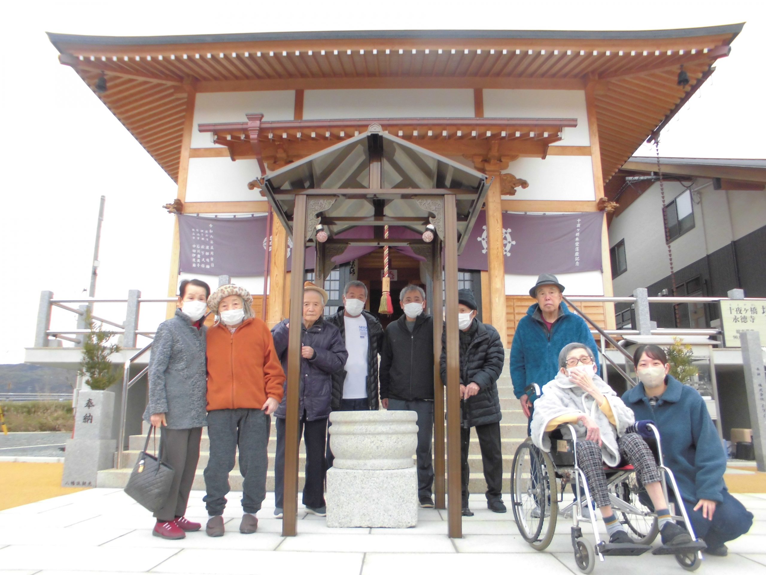 蒼月 十夜ヶ橋へ初詣 2026.02.27 グループホーム蒼月は、初詣に大洲にある十夜ヶ橋(とよがはし)永徳寺に参拝に出かけました。今年も利用者さまが、毎日元気で楽しく過ごせますように。昨年のクリスマス会では、デイサービスと合同でゲームや出し物、歌をみんなで歌ったりして、とても盛り上がりました。楽しかったですね。
